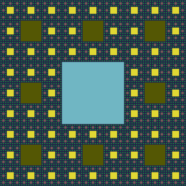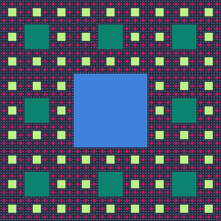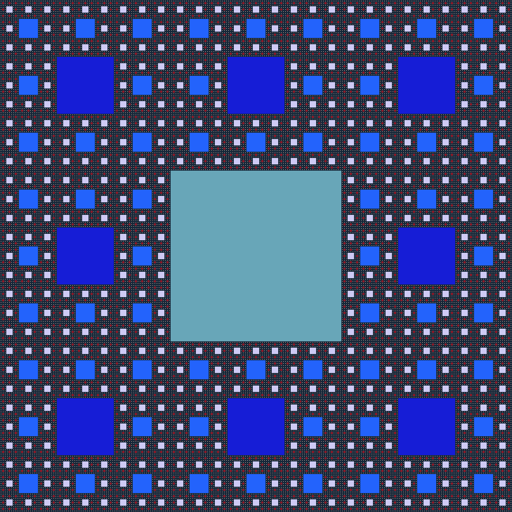 Le tapis de Sierpinsky, que je vous propose de faire en Python, est une image fractale obtenue à partir d’un carré, dans lequel on met d’autres carrés… Bon, dit comme ça, ça ne parle pas beaucoup alors autant mettre une image :