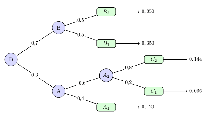 Une fois l’arbre construit et stylisé, il est naturel d’afficher à droite de chaque feuille la probabilité de l’issue correspondante, c’est-à-dire le produit des probabilités rencontrées le long du chemin. Pour cela, on ne peut plus s’appuyer sur edge from parent node — on est arrivé au bout de l’arbre — et on place simplement un nœud annoté à droite de chaque feuille, en utilisant l’option node[right] directement après le nœud feuille :